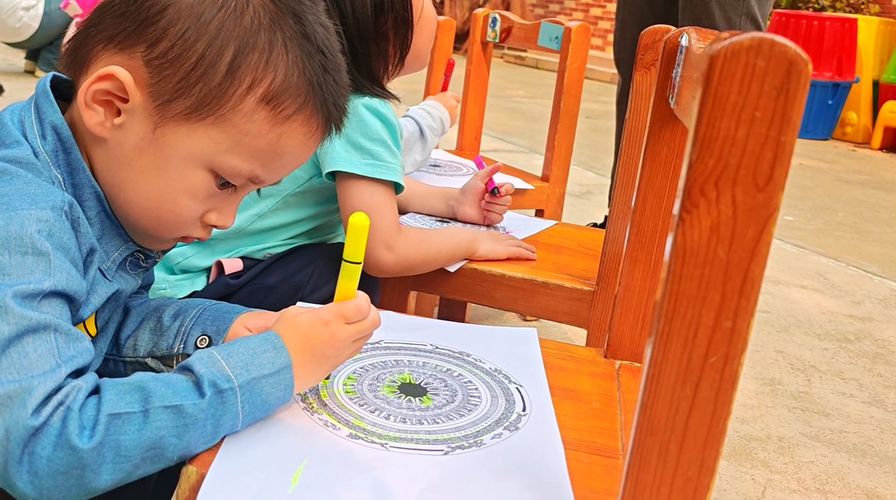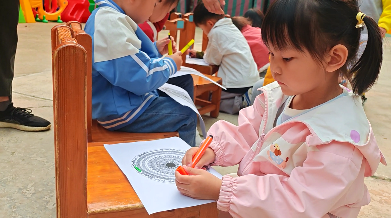 之后,助教老师将绘有铜鼓图案的作品发给同学们,孩子们认真的在印有铜鼓轮廓的画纸上,用彩笔自由涂出自己眼中的铜鼓图案。