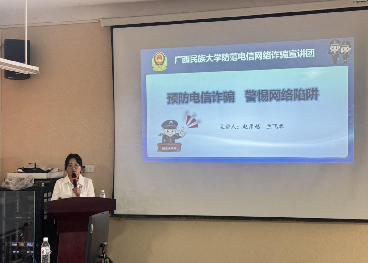 兰飞妮则聚焦新型诈骗手段,通过AI换脸诈骗案例视频,直观展示了犯罪分子的作案手法。她系统讲解了刷单返利、虚假投资理财等诈骗套路,强调"高回报"背后往往暗藏陷阱。针对当前高发的网络诈骗类型,重点介绍了“三不一多”防范原则,即:未知链接不点击、陌生来电不轻信、个人信息不泄露、转账汇款多核实。