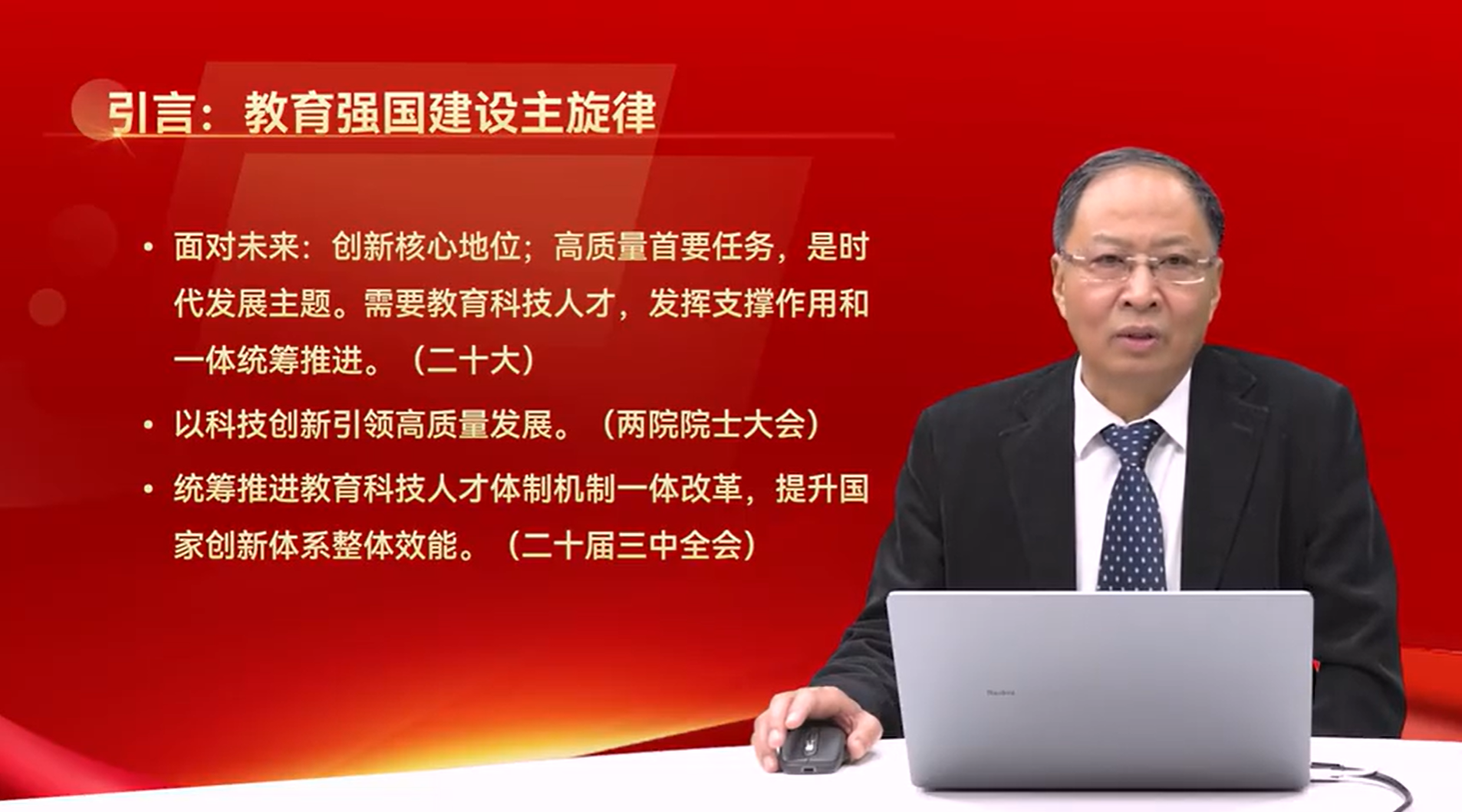 在课程的最后,马老师提出了教育科技人才一体统筹推进的思路。说要以要以创新为引领,将教育、科技、人才三者有机结合,一体到“科教融汇、产教融合”上,形成“新动能”和“新质生产力”,从而提升国家创新体系的整体效能,为社会主义现代化强国建设提供坚实支撑。